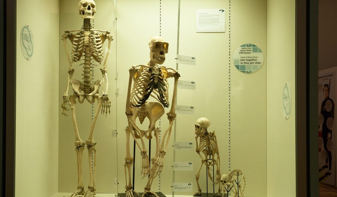 The skeletal system provides unique insights into how various animal species have adapted their physical structures for efficiency, strength, and agility. When examining primates and their adaptations, it becomes essential to understand the implications these adaptations have for skeletal athlete training. Primate skeletal structures exhibit a fascinating blend of lightweight components and strong joints, enabling them to maneuver skillfully through challenging environments. By observing their anatomy, trainers can glean lessons applicable to human athletes. Biomechanics studies show that primates possess specialized adaptations, such as elongated limbs and robust wrist structures designed for climbing and brachiation. These adaptations promote muscle engagement and optimize energy expenditure, crucial factors in enhancing athletic performance. It’s remarkable how certain structural features facilitate improved balance and coordination, two skills vital for athletes focused on maximizing performance during training sessions. Incorporating the lessons from the primate skeletal system into strength training regimes can yield significant benefits. Additionally, an understanding of the evolutionary development of these features could offer insight into the potential for human athleticism. Emphasizing agility and flexibility in training regimens can foster a well-rounded athletic profile for various sports disciplines.
