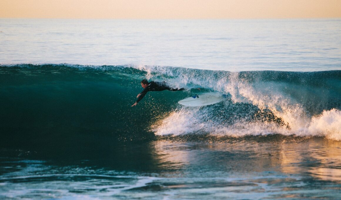 Lastly, maintain proper nutrition and hydration throughout your training. Fueling your body with the right nutrients can significantly impact your performance levels on the board. Consuming a balanced diet rich in lean proteins, whole grains, fruits, and vegetables provides the energy needed for rigorous training. Additionally, consider incorporating hydration strategies; water plays a crucial role in maintaining focus and reaction times during long surf sessions. Dehydration can slow down both your physical and cognitive abilities, hindering your performance. Don’t forget to incorporate healthy fats into your diet, as they are essential for overall wellness and energy storage. Proper meal timing can also be beneficial; consume light snacks before your surf sessions to boost your energy without feeling heavy. Furthermore, monitor your post-workout recovery as it’s important for muscles to repair and grow stronger. Taking care of your body with proper nutrition will lead to better strength, agility, and improved reaction times. Prioritizing your health ensures you have the stamina needed for those extended surfing days spent in the water, maximizing your potential in surfing while enjoying the adventure.
